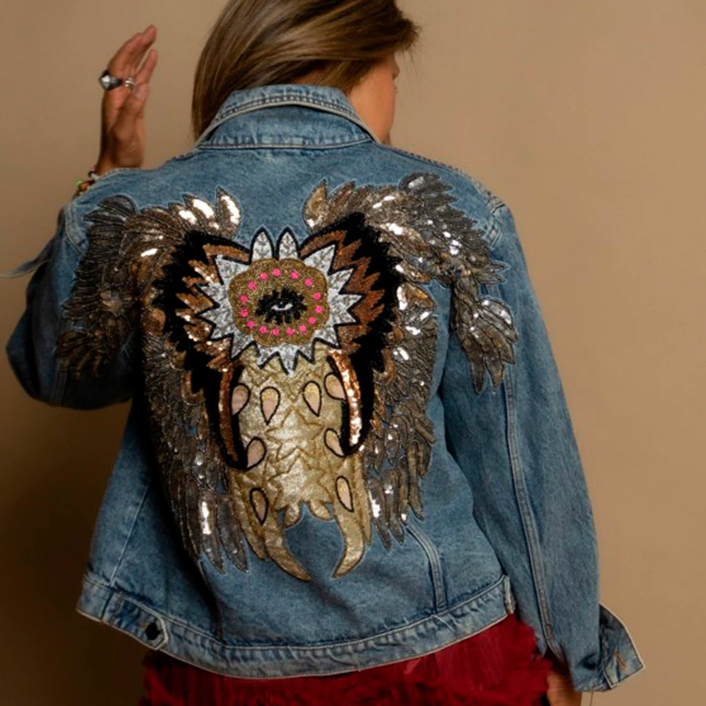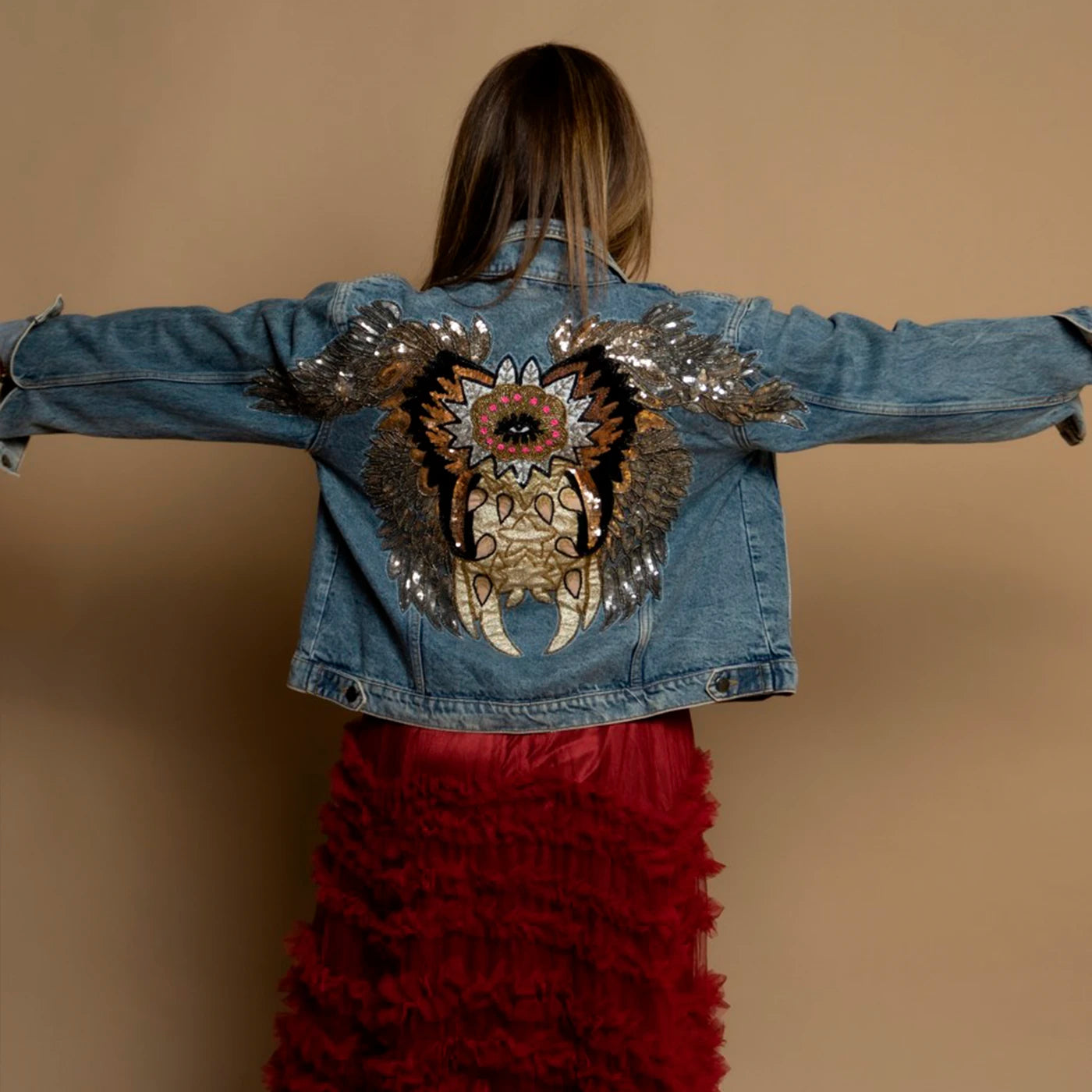 Make a statement with this striking denim jacket adorned with intricate sequin embroidery. The centerpiece of this design is a radiant angelic eye surrounded by dazzling golden and silver wings, symbolizing vision, protection, and empowerment. The vibrant details and shimmering accents create a show-stopping look perfect for bold, fashion-forward individuals.