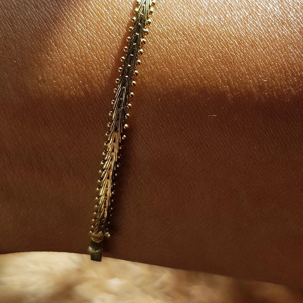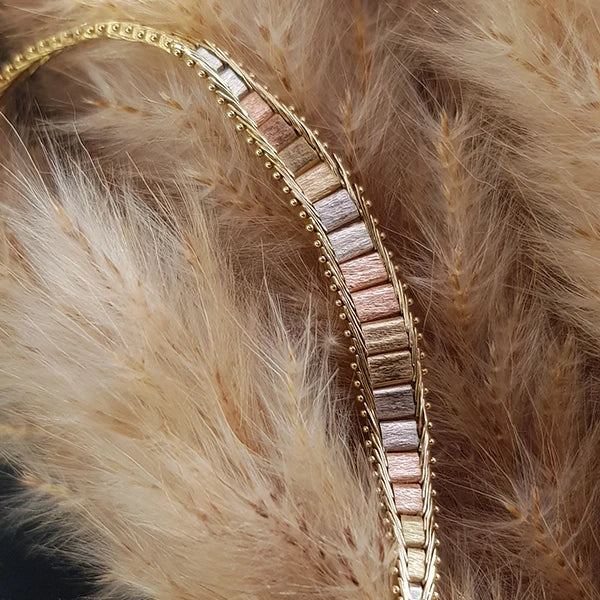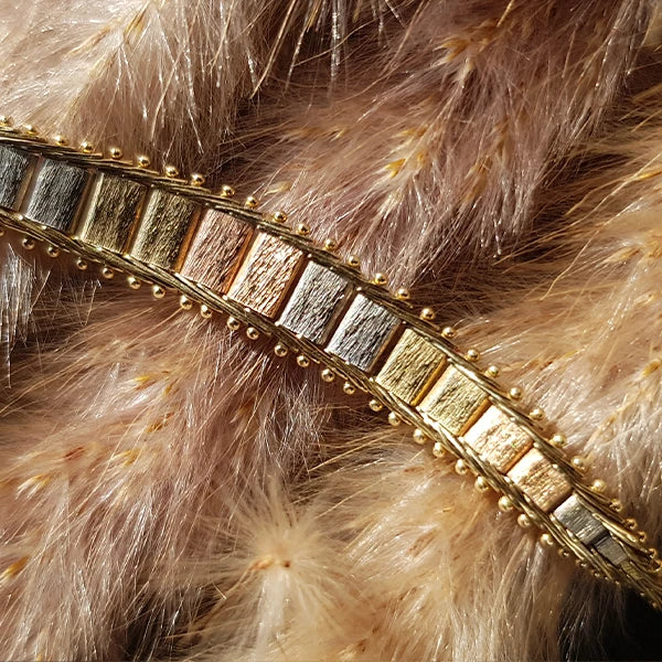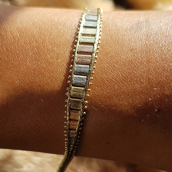 This stunning vintage bracelet is crafted from 14K tri-color gold, featuring a beautiful and elegant design. The intricate interlacing of yellow, white, and rose gold creates a timeless piece with a special charm. Perfect for adding a touch of classic elegance to any outfit, this bracelet is a must-have for any jewelry collection. Its unique blend of three gold tones makes it versatile and eye-catching, ideal for both everyday wear and special occasions. Don't miss the chance to own this exquisite piece of vintage jewelry.